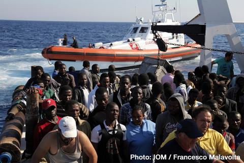 The Italian Harbourmaster Corps (Coast Guard) in Rome rescues migrants bound to the coasts of Italy. © Francesco Malavolta 2014 The Italian Coast Guard rescues migrants bound for Italy. © Francesco Malavolta/IOM 2014