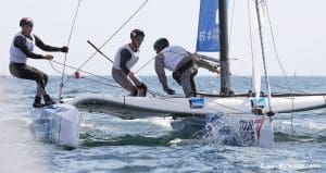 “The wind came back blowing offshore. The land is very hot and so it was very unstable. We had an idea from watching the race before. Yesterday we tried to come to the shore to find the wind and it did not work. Today it did.” Morrison recalled, “To win the Final is great fun but we came here to win the Tour de France and that seems unlikely now. When it is gusty like that you want to be up the line to get the gust first. The whole fleet was thinking that and we could be a bit more aggressive because of that.”