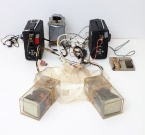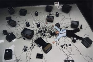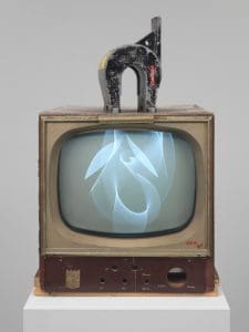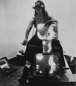 The duo followed up with a series of “television sculptures,” TV Bra for Living Sculpture, TV Cello and TV Eyeglasses which were worn and played by Moorman. The bra, on display at Tate Modern, projected images of the audience. Like some of his other constructions, it consists of a mix of paraphernalia: video tubes, televisions, rheostat (an electrical instrument used to control a current), foot switches, plexiglass boxes, vinyl straps, cables and copper wires.