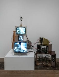 TV Cello. 1971. Installation view, Tate Modern, 2019.Three cathode-ray tubes, acrylic boxes, three television casings, electronics, wiring, wood base, fan and stool. Walker Art Center, TB Walker Acquisition Fund, 1992, Minneapolis. Formerly in the collection of Otto Piene and Elizabeth Goldring, Massachusetts.