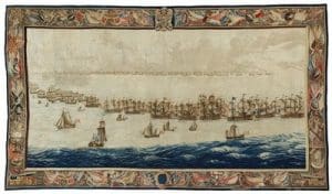 The tapestries are part of a series of six which depict various scenes from the Battle of Solebay in 1672. A first set was commissioned by King Charles II shortly after the battle. It is still in the Royal Collections. One tapestry is on permanent loan to the National Maritime Museum in Greenwich. Thirteen years later Charles’s brother, King James II, commissioned a second set depicting the battle which was broken up for sale in 1914. Four tapestries from this set are currently in American museum collections, but not on public display. The two tapestries acquired by the National Maritime Museum in Amsterdam, were the last ones that will ever appear on the market. They have been restored with great care in the UK.