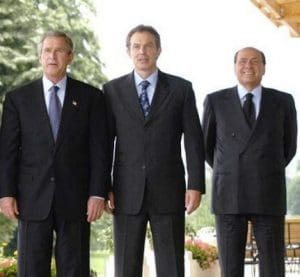 l to r: U.S. President George W. Bush, UK Prime Minister Tony Blair and Italian Prime Minister Silvio Berlusconi. The three leaders were in favor of the war.