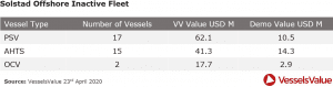 Utilising VesselsValue fleet search and recency of AIS function, VesselsValue are able filter PSVs, AHTs and OCVs within the Solstad fleet that have not signalled in 1 week or more, i.e. are inactive / laid up. These 34 vessels could represent a large portion of the possible 37 sales candidates. The below table shows the inactive vessel breakdown, for full list CLICK HERE
