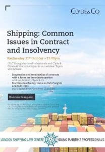 LSLC-YMP and Clyde & Co. Webinar – Common Issues in Contract and Insolvency – 21st October at 12.00pm by admin October 14, 2020 October 14, 2020 46 views 435 LSLC-YMP and Clyde & Co. Webinar – Common Issues in Contract and Insolvency – 21st October at 12.00pm Clyde & Co 0 comments 0 FacebookTwitterLinkedinEmail admin previous post RMT condemns attempts to sail the detained Ben Nevis from Aberdeen in flagrant breach of international maritime law next post Hot Port News from GAC You may also like Stephenson Harwood promotes eleven to partnership April 23, 2026 Blockade and Capture: the significance of M/V TOUSKA April 22, 2026 Fifth Circuit Court of Appeals Reinforces Bunker Suppliers’... April 8, 2026 Costas Mardas questions John Faraclas on the Strait... April 6, 2026 Invitation for LSLC’s event – The International Group’s... March 27, 2026 MAJ Engages Future Legal Professionals on Maritime Sustainability March 27, 2026 MAJ Engages Future Legal Professionals on Maritime Sustainability March 25, 2026 Reminder Invitation for LSLC’s event – Fuel EU... March 16, 2026 DOJ Issues Groundbreaking Corporate Criminal Enforcement Policy: What... March 11, 2026 Cancellation of War Risk Insurance in Gulf and... March 5, 2026 Leave a Comment Cancel Reply Save my name, email, and website in this browser for the next time I comment. Δ