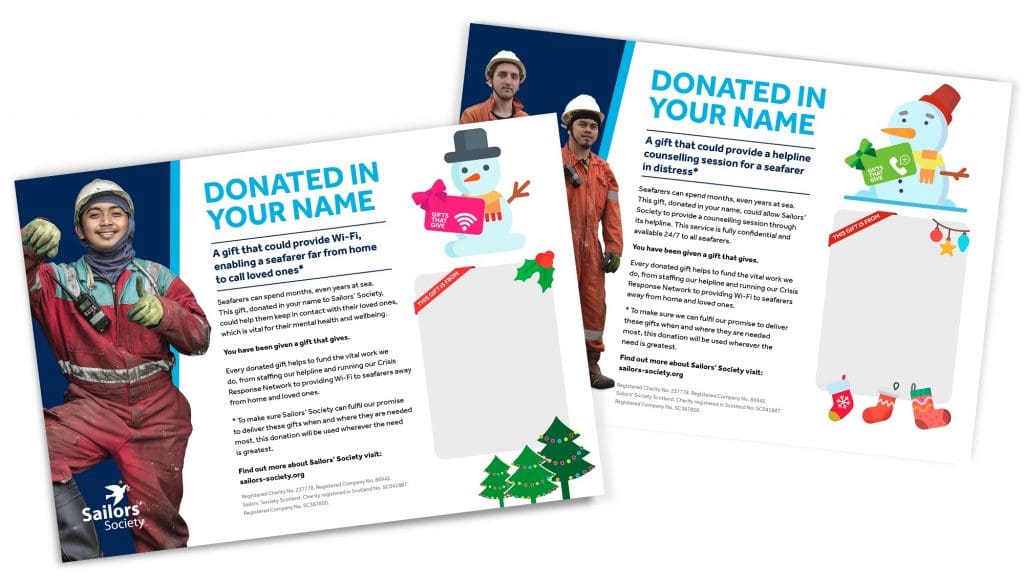 “A gift donated in your name or that of someone you love this Christmas will help fund the vital work we do, from staffing our helpline and running our Crisis Response Network to getting Christmas parcels and Wi-Fi to seafarers away from home and loved ones.