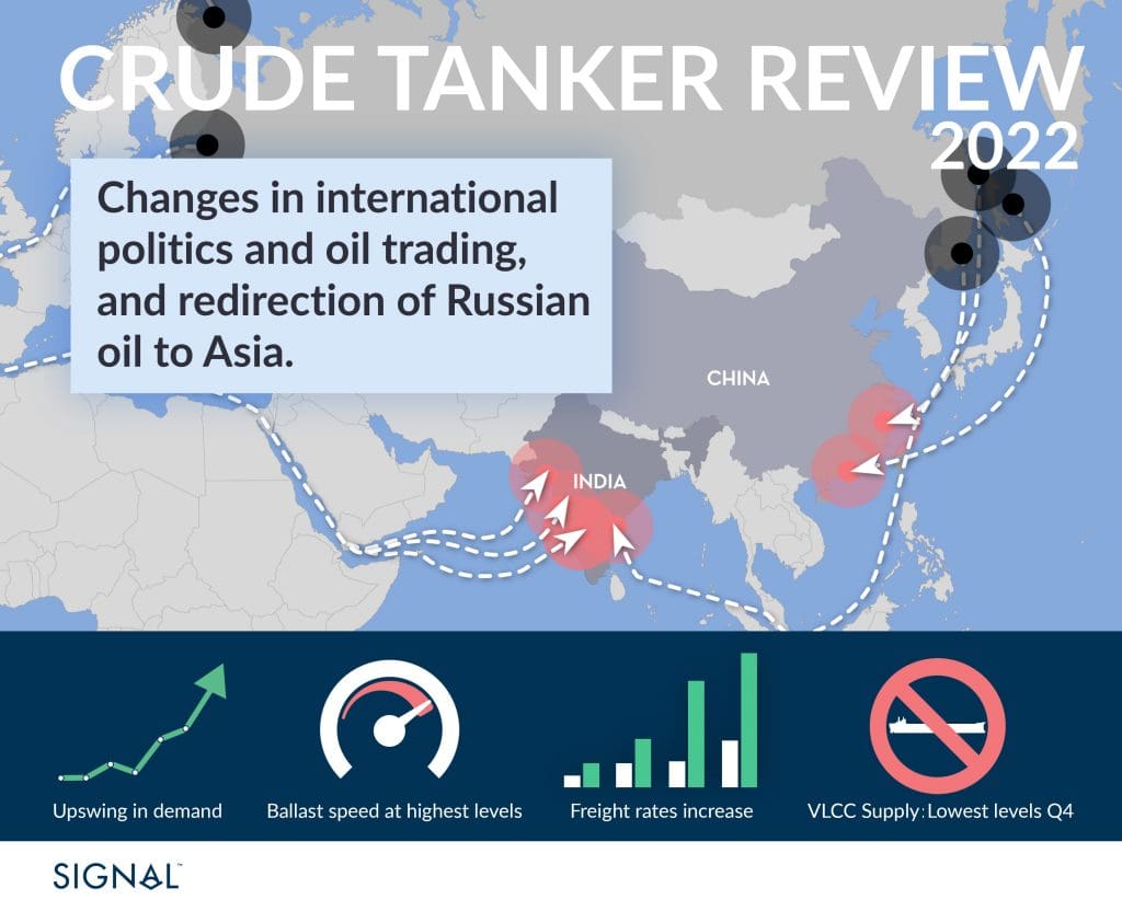 Overall, we see that Suezmax and Aframax vessels are largely influenced by the new patterns in dirty cargo flows amid ongoing geopolitical tensions, while VLCC market sentiment is influenced by the Chinese economic situation and deteriorating demand due to zero policy COVID.