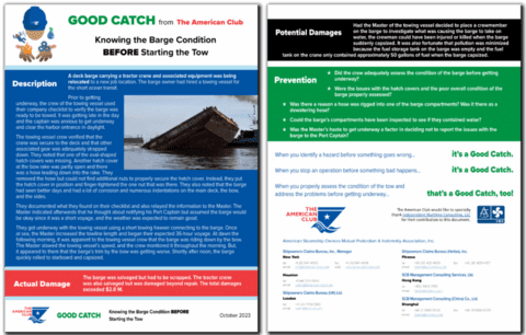 The condition of a tow, including hatch covers, should be properly assessed and any problems addressed before getting underway. Make a Good Catch by taking time to ensure that any issues with the barge are reported to the Port Captain.In this context, your Managers are pleased to present the latest instalment of the Club’s Good Catch initiative: