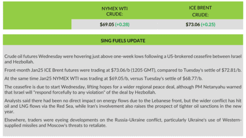 Sing Fuels Daily Report – 27 November 2024 by admin November 27, 2024 November 27, 2024 5 views 292 Brent CrudeHezbollahIsraelRed SeaSingaporeSingFuelsWTI 0 comments 0 FacebookTwitterLinkedinEmail admin previous post Retail reshuffle looks likely in upcoming FTSE Review next post Liberia receives IMSAS Audit You may also like HOT PORT NEWS from GAC April 21, 2026 Christina Tsorba of Vergina TV questions All About... April 21, 2026 Vessev Unlocks Waterways as the Next Layer of... April 21, 2026 Immersion suit rises to challenge for faster protection April 21, 2026 LR – Class News 08/2026: Revised speed trial... April 21, 2026 Market Report: choppy week ahead as Middle East... April 21, 2026 Sing Fuels Morning Report – 21 April 2026 April 21, 2026 Annual marine autonomy study reports new USV ‘arms... April 20, 2026 Market report: Stock markets mixed as Strait re-opening... April 20, 2026 StormGeo strengthens Bunker Management platform with real-time pricing... April 20, 2026 Leave a Comment Cancel Reply Save my name, email, and website in this browser for the next time I comment. Δ