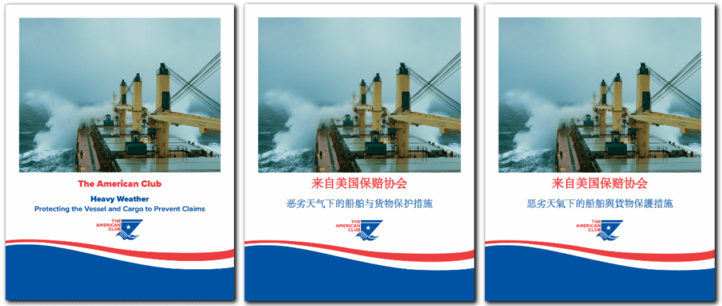 Your Managers are pleased to announce the publication of a new guidance document, Heavy Weather – Protecting the Vessel and Cargo to Prevent Claims, available in English, and new and traditional Mandarin, which focuses on risks to the vessel and cargo as well as risks to the crew. It complements the Club’s previous guidance, Heavy Weather – All hands on deck?, which focused on evaluating the risks to crew members going out on deck in heavy weather.