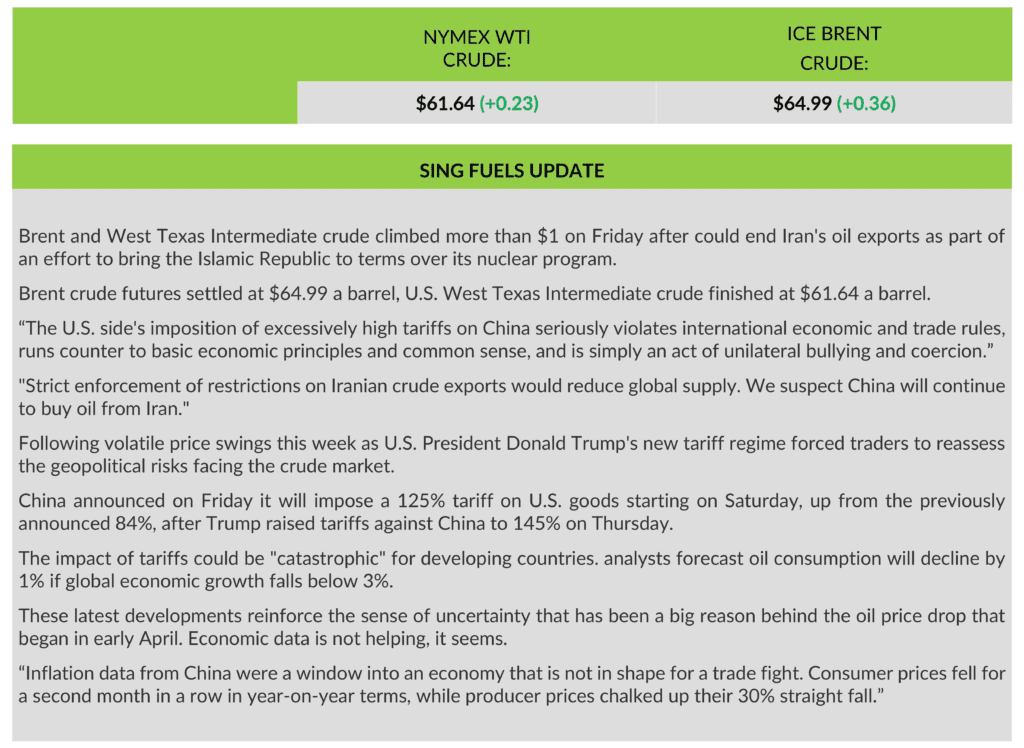 Sing Fuels Daily Report – 14 April 2025 by admin April 14, 2025 April 14, 2025 5 views 255 Brent CrudeChinaIranSingaporeSingFuelsTariffsWTI (West Texas Interediate) 0 comments 0 FacebookTwitterLinkedinEmail admin previous post HOT PORT NEWS from GAC next post ME-GI Swings Container Decision You may also like Sing Fuels Morning Report – 27 April 2027 April 27, 2026 Wirana Market Outlook Report Shows Ship Recycling Prices... April 27, 2026 Poetic Living: Luisa Beccaria’s Interior Design Debut Brings... April 25, 2026 Navigating the Great Transitions: Strategic Insights from Delphi... April 25, 2026 RINA grants Type Approval to SRC Group’s Methanol... April 25, 2026 Event Reminder | Watts & Waves Forum |... April 25, 2026 The Maritime Advocate–Issue 906 April 24, 2026 HOT PORT NEWS from GAC April 24, 2026 No safe transit through Strait of Hormuz: IMO... April 24, 2026 Policy, regulation and deployment begin to align across... April 24, 2026 Leave a Comment Cancel Reply Save my name, email, and website in this browser for the next time I comment. Δ