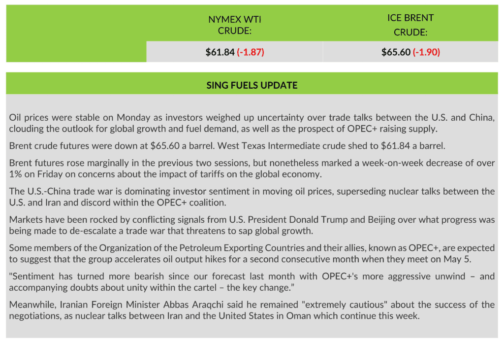 Sing Fuels Daily Report – 28 April 2025 by admin April 28, 2025 April 28, 2025 11 views 219 Brent CrudeChinaOPEC+SingaporeSingFuelsU.S.A.-China trade warUSAWTI (West Texas Intermediate) 0 comments 0 FacebookTwitterLinkedinEmail admin previous post HOT PORT NEWS from GAC next post NEW Report: Our Ocean Conference delivers $133 billion for Ocean Action You may also like HOT PORT NEWS from GAC April 21, 2026 Maritime Coalition Representing Half the World’s Fleet Calls... April 21, 2026 Stubbs: Portrait of a Horse. National Gallery on... April 21, 2026 Christina Tsorba of Vergina TV questions All About... April 21, 2026 EcoNavis to lead US integrated propulsion study April 21, 2026 Vessev Unlocks Waterways as the Next Layer of... April 21, 2026 Immersion suit rises to challenge for faster protection April 21, 2026 Bubble Robotics raises $5M to build the ocean’s... April 21, 2026 Wärtsilä launches next-generation simulation platform to support future-ready... April 21, 2026 LR – Class News 08/2026: Revised speed trial... April 21, 2026 Leave a Comment Cancel Reply Save my name, email, and website in this browser for the next time I comment. Δ