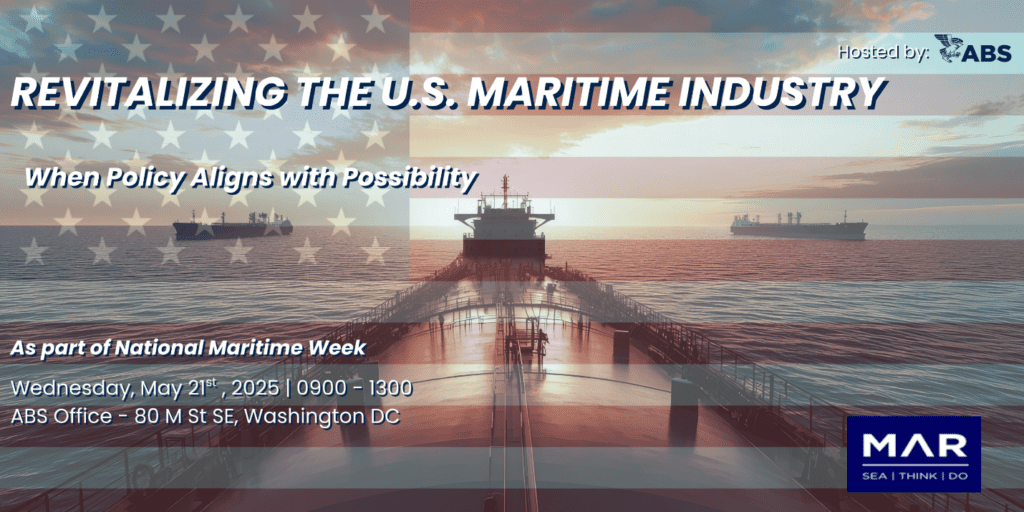 May 6, 2025: Washington, D.C. –Join industry stakeholders and government officials for The Maritime Accelerator for Resilience (MAR)’s “Revitalizing the U.S. Maritime Industry” on Wednesday, May 21, 2025, from 9:00 AM to 1:00 PM. The event will be held at the ABS’ Offices, located at 80 M St SE in Washington, D.C. It will bring together maritime executives, innovative leaders, and key partners to dissect a new vision for America’s maritime future. This event is a part of National Maritime Week, taking place from May 20th to May 22nd in Washington, D.C.