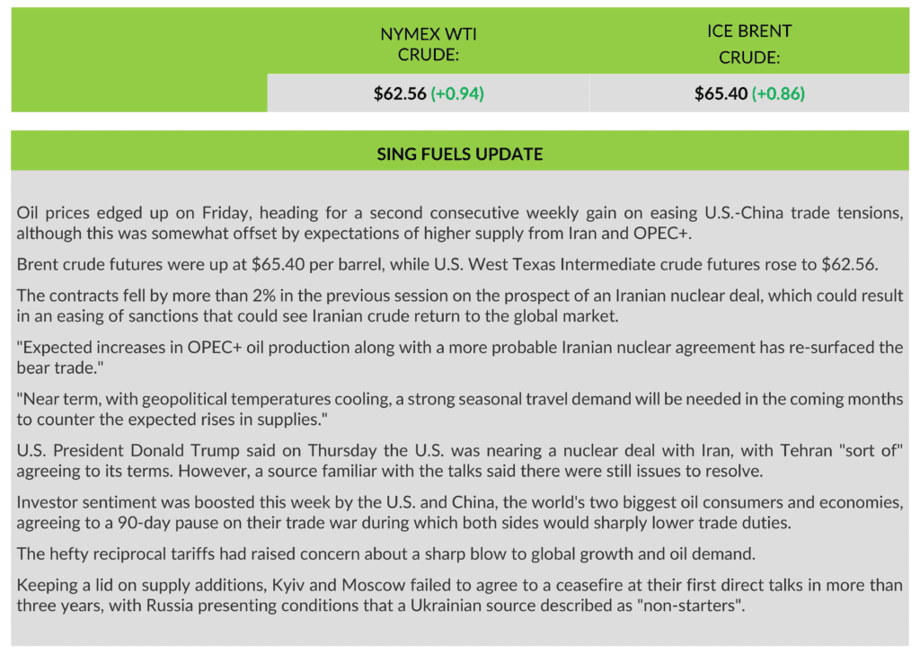Sing Fuels Daily Report – 16 May 2025 by admin May 16, 2025 May 16, 2025 30 views 279 Brent CrudeChinaIranian nuclear dealKyivMoscowOPEC+President Donald TrumpSingaporeSingFuelsTehranUSAWTI (West Texas Intermediate) 0 comments 0 FacebookTwitterLinkedinEmail admin previous post All-Energy 2025 breaks last year’s record next post HOT PORT NEWS from GAC You may also like Market report: Stock markets mixed as Strait re-opening... April 20, 2026 StormGeo strengthens Bunker Management platform with real-time pricing... April 20, 2026 Multimodal Corridors Gain Ground as Supply Chains Reconfigure,... April 20, 2026 Sing Fuels Morning Report – 20 April 2026 April 20, 2026 NYK Line, Golden Island, and Yara Clean Ammonia... April 20, 2026 From LNG to low‑GHG methane: The next step... April 18, 2026 Statement from the International Chamber of Shipping related... April 17, 2026 HOT PORT NEWS from GAC April 17, 2026 IMO approves new guidelines on ship registratio April 17, 2026 S&P 500 heads for new heights as Iran... April 17, 2026 Leave a Comment Cancel Reply Save my name, email, and website in this browser for the next time I comment. Δ