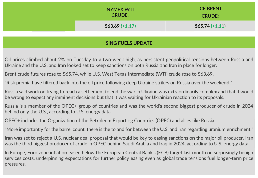 Sing Fuels Daily Report – 3 June 2025 by admin June 3, 2025 June 3, 2025 8 views 266 Brent CrudeECB (European Central Bank)EurozoneIranIraqOPEC+RussiaSaudi ArabiaSingaporeSingFuelsUkraineUSAWarWTI (West Texas Intermediate) 0 comments 0 FacebookTwitterLinkedinEmail admin previous post Supply Chain Leaders Urged to Secure Free Registration for Record-Breaking Multimodal 2025 next post HOT PORT NEWS from GAC You may also like From LNG to low‑GHG methane: The next step... April 18, 2026 London based fund with Greek interests, secures the... April 17, 2026 HOT PORT NEWS from GAC April 17, 2026 IMO approves new guidelines on ship registratio April 17, 2026 S&P 500 heads for new heights as Iran... April 17, 2026 IMO Secretary-General statement to the France-UK Summit on... April 17, 2026 LR – Engine Retrofit Report: Applying alternative fuels... April 17, 2026 Strategic expansion in the Greek market: MASO Strategic... April 17, 2026 DNV- Upcoming training courses April 17, 2026 Owners need to consider the scope of their... April 17, 2026 Leave a Comment Cancel Reply Save my name, email, and website in this browser for the next time I comment. Δ