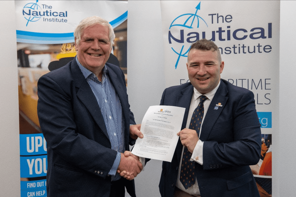 Capt John Lloyd (left), CEO of the Nautical Institute with Capt Matthew Schanck, Chairperson of the Maritime Search and Rescue Council and the new agreement.