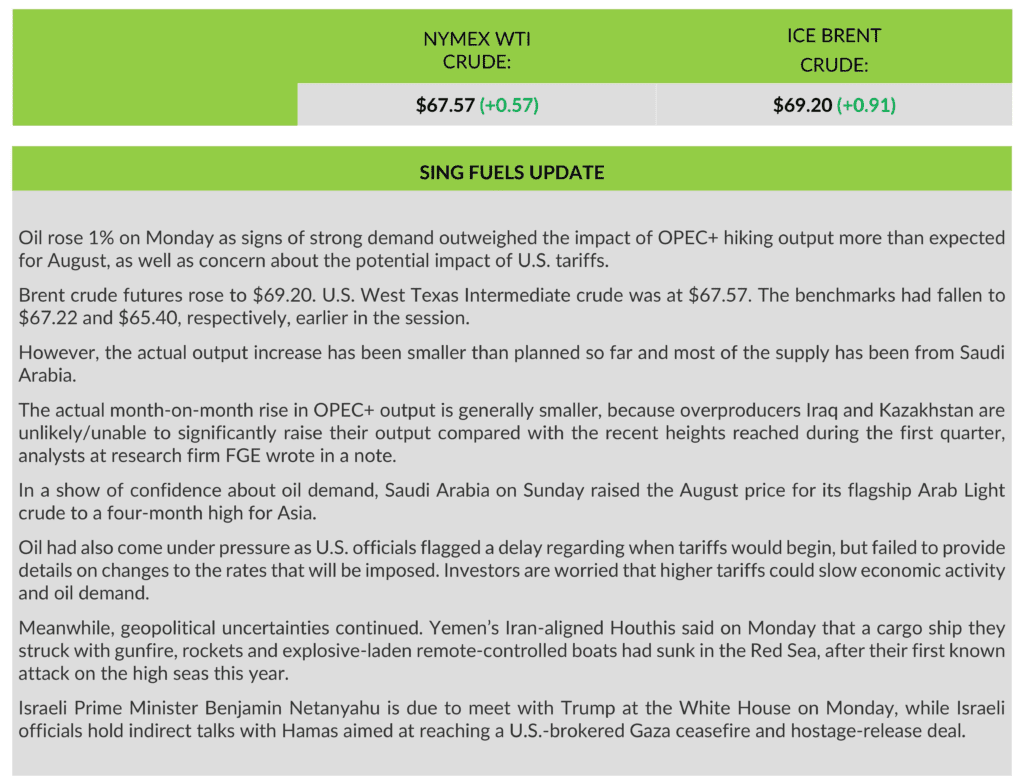 Sing Fuels Daily Report – 7 July 2025 by admin July 7, 2025 July 7, 2025 24 views 375 Brent CrudeGazaHamasIraqIsraeli PM Benjamin NetanyahuKazakhstanOPEC+Saudi ArabiaSingaporeSingFuelsUS TariffsWTI (West Texas Intermediate) 0 comments 0 FacebookTwitterLinkedinEmail admin previous post Descartes MacroPoint™ FraudGuard 2.0 Provides Transportation Industry with Next-Generation Solution for Freight Fraud Defense next post Monaco unites in black and white for Fight Aids gala You may also like BAAFEx returning in 2027 as Asia Strengthens Position... April 22, 2026 DNV and SIT sign new agreement to advance... April 22, 2026 HOT PORT NEWS from GAC April 21, 2026 Maritime Coalition Representing Half the World’s Fleet Calls... April 21, 2026 Stubbs: Portrait of a Horse. National Gallery on... April 21, 2026 Christina Tsorba of Vergina TV questions All About... April 21, 2026 EcoNavis to lead US integrated propulsion study April 21, 2026 Vessev Unlocks Waterways as the Next Layer of... April 21, 2026 Immersion suit rises to challenge for faster protection April 21, 2026 Bubble Robotics raises $5M to build the ocean’s... April 21, 2026 Leave a Comment Cancel Reply Save my name, email, and website in this browser for the next time I comment. Δ
