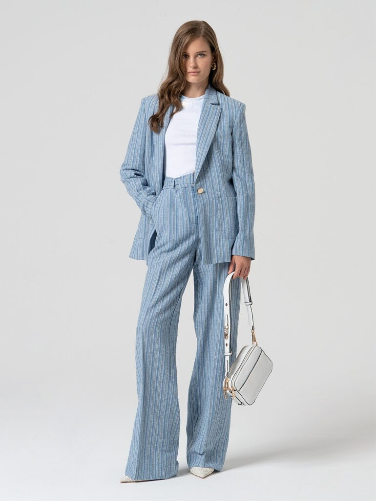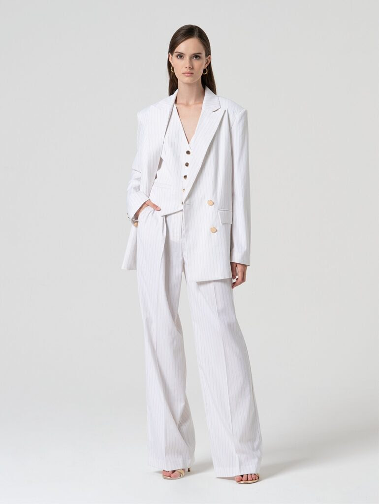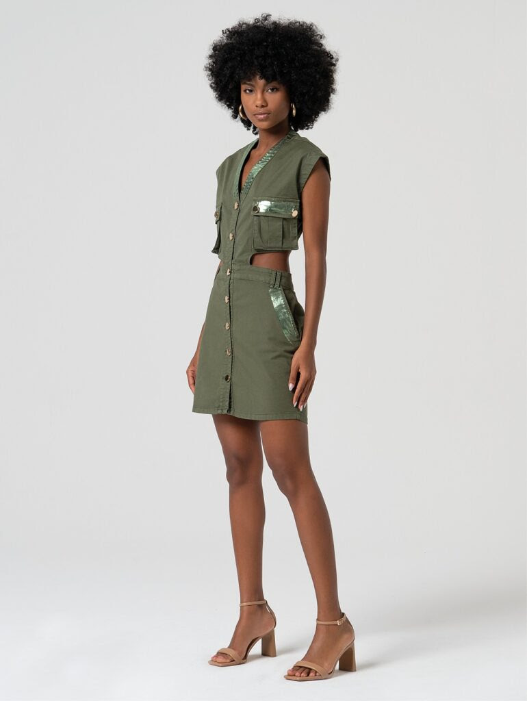 Daywear, meanwhile, leans into effortless tailoring. A baby blue pinstripe suit channels soft power dressing with relaxed energy, while an army green utility dress with metallic detailing brings an edge to safari chic.