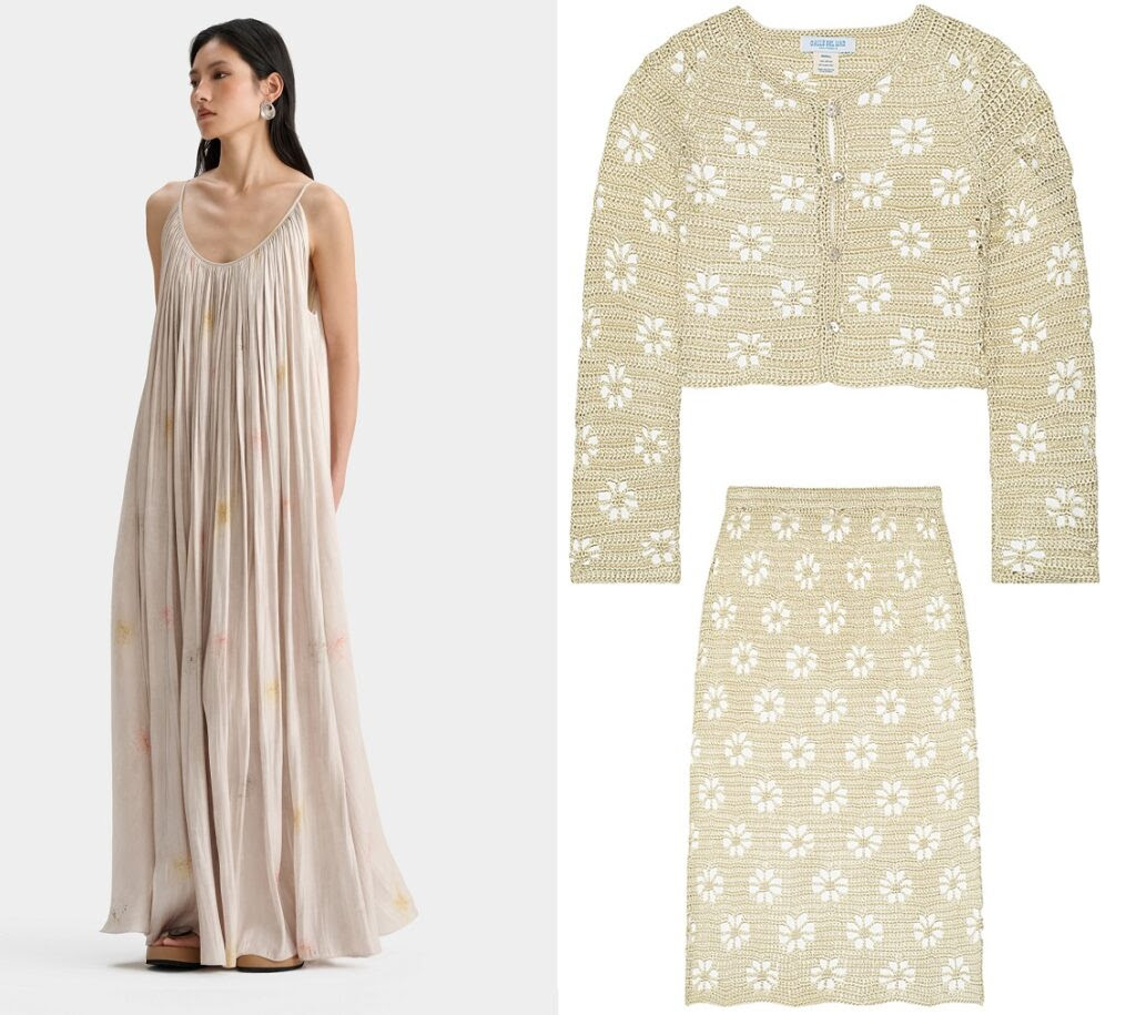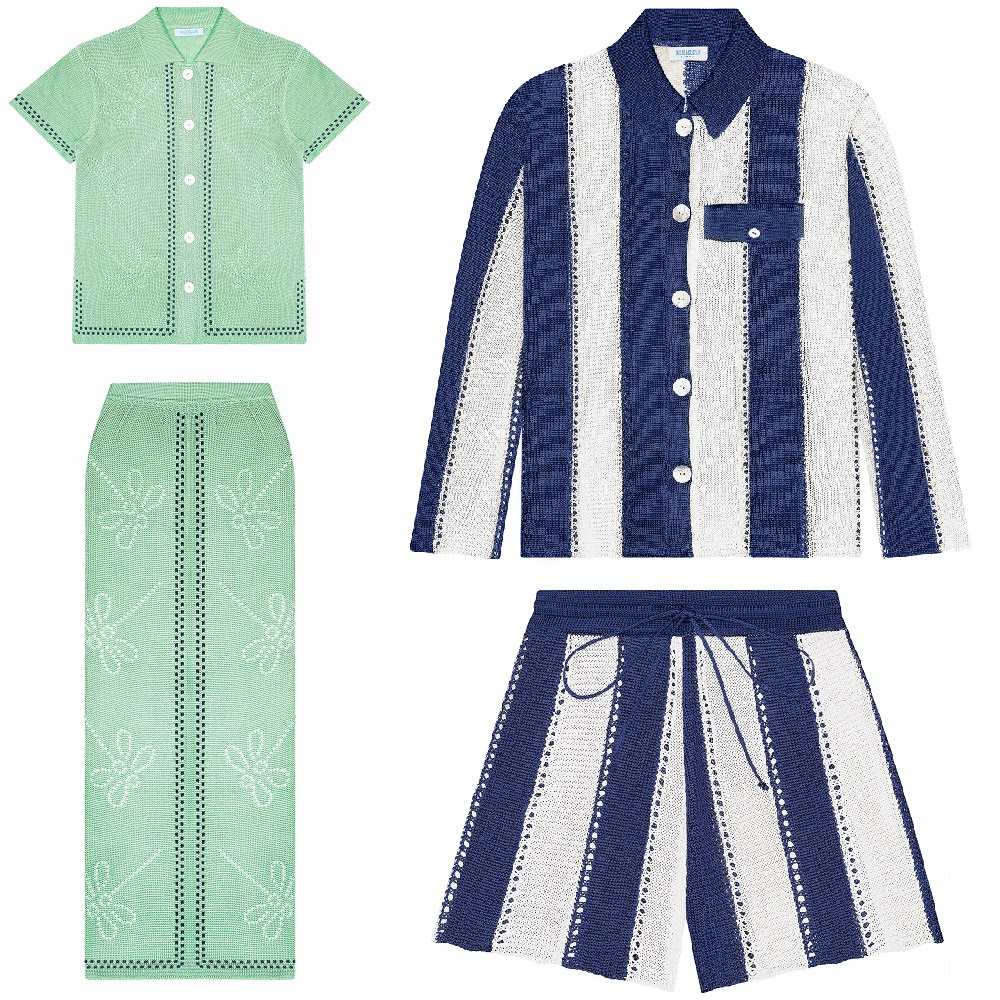 Calle del Mar, the Los Angeles–based brand known for its artisanal knitwear, offers an impeccable answer to daytime dressing. Whether you gravitate toward the powdery charm of pastels or the bold clarity of nautical stripes, their hand-crocheted co-ords and breezy sets are both breathable and elevated. The green two-piece sets add a gentle freshness to your holiday wardrobe, while blue-and-white stripes give Riviera-ready energy with a refined, contemporary edge. Pair them with sandals or espadrilles for a fresh and fashion-forward daytime look.