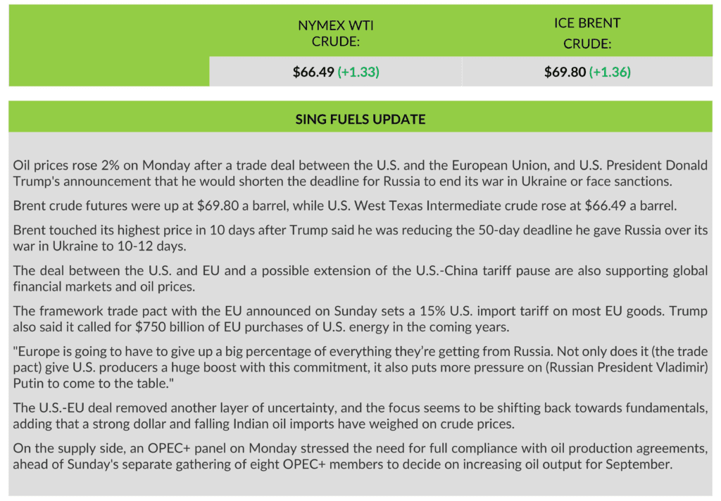 Sing Fuels Daily Report – 28 July 2025 by admin July 28, 2025 July 28, 2025 20 views 254 Brent CrudeChinaOPEC+RussiaSingaporeSingFuelsTariffsUkraineUSAWTI (West Texas Intermediate) 0 comments 0 FacebookTwitterLinkedinEmail admin previous post Diana announces t/c for m/v Astarte next post “K” LINE Participates in Onboard Fire Response Drill at Laem Chabang Port You may also like HOT PORT NEWS from GAC April 21, 2026 Maritime Coalition Representing Half the World’s Fleet Calls... April 21, 2026 Stubbs: Portrait of a Horse. National Gallery on... April 21, 2026 Christina Tsorba of Vergina TV questions All About... April 21, 2026 EcoNavis to lead US integrated propulsion study April 21, 2026 Vessev Unlocks Waterways as the Next Layer of... April 21, 2026 Immersion suit rises to challenge for faster protection April 21, 2026 Bubble Robotics raises $5M to build the ocean’s... April 21, 2026 Wärtsilä launches next-generation simulation platform to support future-ready... April 21, 2026 LR – Class News 08/2026: Revised speed trial... April 21, 2026 Leave a Comment Cancel Reply Save my name, email, and website in this browser for the next time I comment. Δ