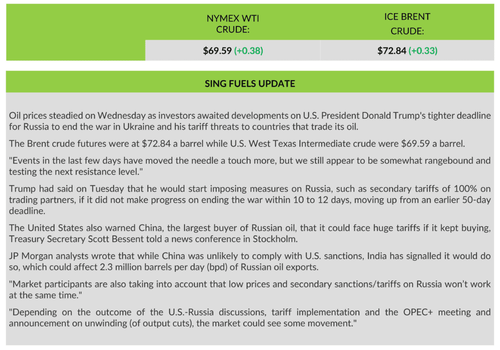 Sing Fuels Daily Report – 30 July 2025 by admin July 31, 2025 July 31, 2025 14 views 183 Brent CrudeChinaJP MorganOPEC+RussiaSingaporeSingFuelsUkraineUS President Donald TrumpUSAWTI (West Texas Intermediate) 0 comments 0 FacebookTwitterLinkedinEmail admin previous post Princess Charlene Foundation brings water safety to life for Children of Venice next post BSM to launch its first methanol bunkering simulator to prepare seafarers for a low-carbon future You may also like Annual marine autonomy study reports new USV ‘arms... April 20, 2026 Market report: Stock markets mixed as Strait re-opening... April 20, 2026 StormGeo strengthens Bunker Management platform with real-time pricing... April 20, 2026 Multimodal Corridors Gain Ground as Supply Chains Reconfigure,... April 20, 2026 Sing Fuels Morning Report – 20 April 2026 April 20, 2026 NYK Line, Golden Island, and Yara Clean Ammonia... April 20, 2026 Procureship strengthens Asia-Pacific presence as key shipowners in... April 20, 2026 D-2 to the French Olympic Week of Hyères... April 18, 2026 From LNG to low‑GHG methane: The next step... April 18, 2026 London based fund with Greek interests, secures the... April 17, 2026 Leave a Comment Cancel Reply Save my name, email, and website in this browser for the next time I comment. Δ