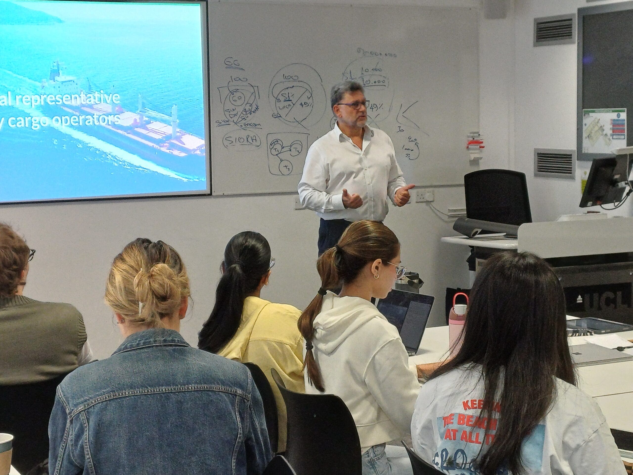 With meticulously construed up to date slides covering every aspect of INTERCARGO’s functions as well as explanations by drawing board, the speaker excelled in giving the audience of students food for thought on the work of one of the most important shipping business associations.