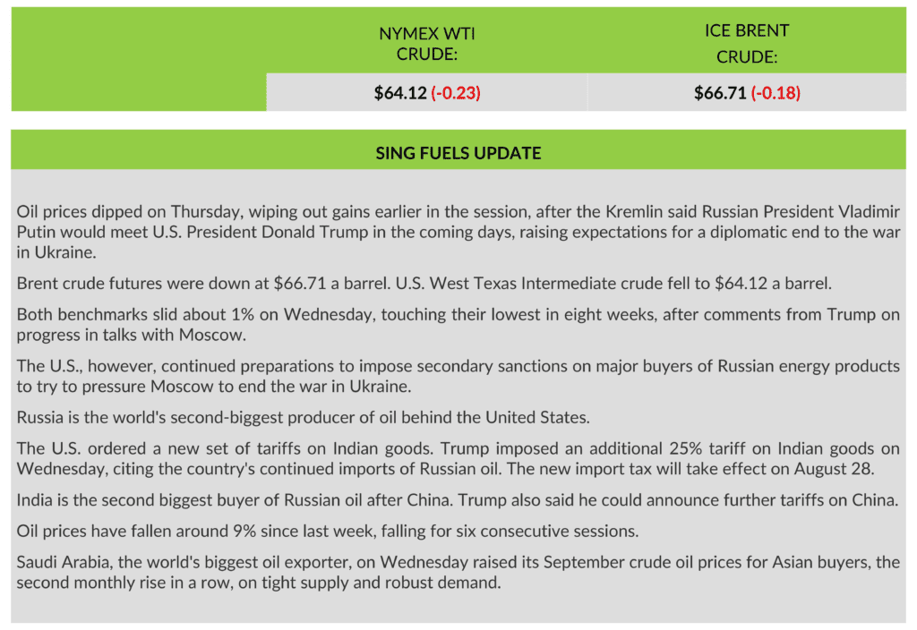 Sing Fuels Daily Report – 7 August 2025 by admin August 7, 2025 August 7, 2025 26 views 243 Brent CrudeChinaIndiaRussian President Vladimir PutinSaudi ArabiaSingaporeSingFuelsTariffsUkraineUS President Donald TrumpUSAWTI (West Texas Intermediate) 0 comments 0 FacebookTwitterLinkedinEmail admin previous post “GPS spoofing and groundings: Are shipowners still covered?” asks the AAA next post HOT PORT NEWS from GAC You may also like Market Report: Equity markets send mixed signals as... April 24, 2026 BAAFEx returning in 2027 as Asia Strengthens Position... April 24, 2026 HOT PORT NEWS from GAC April 23, 2026 Panama Canal Meets Rising Demand April 23, 2026 Shareholders vote against BP and in favour of... April 23, 2026 Xeneta: The extended ceasefire can be seen as... April 23, 2026 Market Report: FTSE extends losses as UK PMI... April 23, 2026 Sing Fuels Morning Report – 23 April 2026 April 23, 2026 London-based jeweller Nazan Alhas presents her Golden Fields... April 22, 2026 Transforming The Red Sea Corridor Into A Pivotal... April 22, 2026 Leave a Comment Cancel Reply Save my name, email, and website in this browser for the next time I comment. Δ