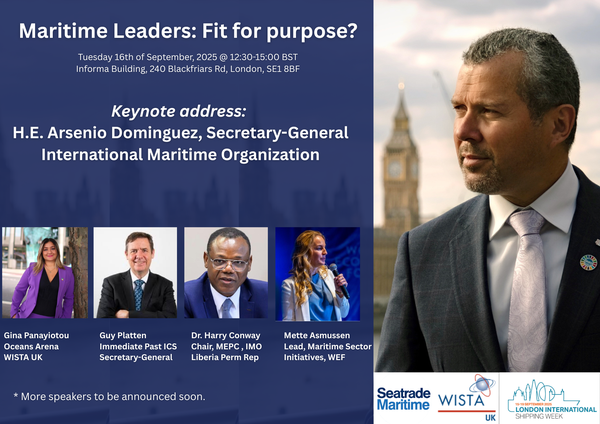 Also on 18th September starting at 2pm, hosted at Stephenson Harwood in Finsbury Circus, is the WISTA UK, Stephenson Harwood and the Nautical Institute event : Maritime Decarbonisation – People, Fuels and Power. This exciting event will cover 2 sessions,