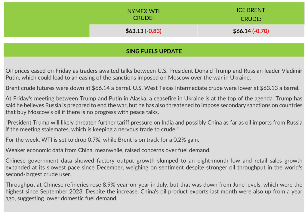 Sing Fuels Daily Report – 15 August 2025 by admin August 15, 2025 August 15, 2025 25 views 233 AlaskaBrent CrudeChinaIndiaRussian President Vladimir PutinSingaporeSingFuelsTariffsUkraineUS President Donald TrumpUSAWTI (West Texas Intermediate) 0 comments 0 FacebookTwitterLinkedinEmail admin previous post Students go free with Stena Line next post HOT PORT NEWS from GAC You may also like Annual marine autonomy study reports new USV ‘arms... April 20, 2026 Market report: Stock markets mixed as Strait re-opening... April 20, 2026 StormGeo strengthens Bunker Management platform with real-time pricing... April 20, 2026 Multimodal Corridors Gain Ground as Supply Chains Reconfigure,... April 20, 2026 Sing Fuels Morning Report – 20 April 2026 April 20, 2026 NYK Line, Golden Island, and Yara Clean Ammonia... April 20, 2026 Procureship strengthens Asia-Pacific presence as key shipowners in... April 20, 2026 D-2 to the French Olympic Week of Hyères... April 18, 2026 From LNG to low‑GHG methane: The next step... April 18, 2026 London based fund with Greek interests, secures the... April 17, 2026 Leave a Comment Cancel Reply Save my name, email, and website in this browser for the next time I comment. Δ