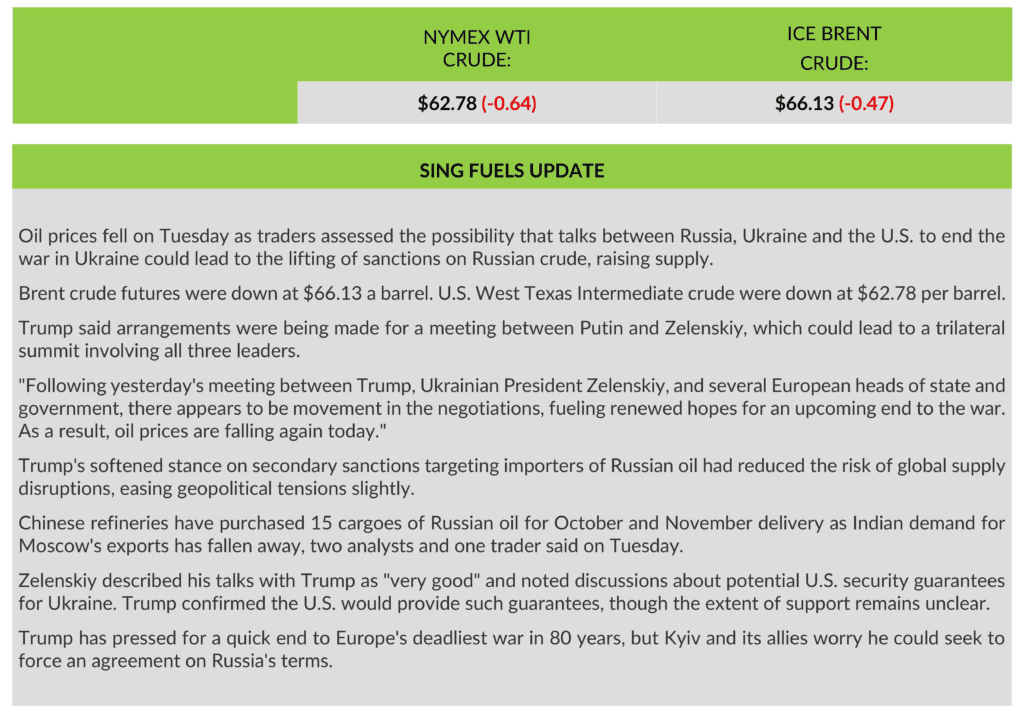Sing Fuels Daily Report – 19 August 2025 by admin August 19, 2025 August 19, 2025 12 views 214 Brent CrudeChinaIndiaRussiaRussian President Vladimir PutinSingaporeSingFuelsTariffsUkraineUkrainian President ZelenskyUS President Donald TrumpUSAWTI (West Texas Intermediate) 0 comments 0 FacebookTwitterLinkedinEmail admin previous post IUMI calls for marine insurers to raise their awareness of modern slavery risks in global supply chains next post HOT PORT NEWS from GAC You may also like D-2 to the French Olympic Week of Hyères... April 18, 2026 From LNG to low‑GHG methane: The next step... April 18, 2026 London based fund with Greek interests, secures the... April 17, 2026 Statement from the International Chamber of Shipping related... April 17, 2026 HOT PORT NEWS from GAC April 17, 2026 IMO approves new guidelines on ship registratio April 17, 2026 S&P 500 heads for new heights as Iran... April 17, 2026 IMO Secretary-General statement to the France-UK Summit on... April 17, 2026 LR – Engine Retrofit Report: Applying alternative fuels... April 17, 2026 Strategic expansion in the Greek market: MASO Strategic... April 17, 2026 Leave a Comment Cancel Reply Save my name, email, and website in this browser for the next time I comment. Δ
