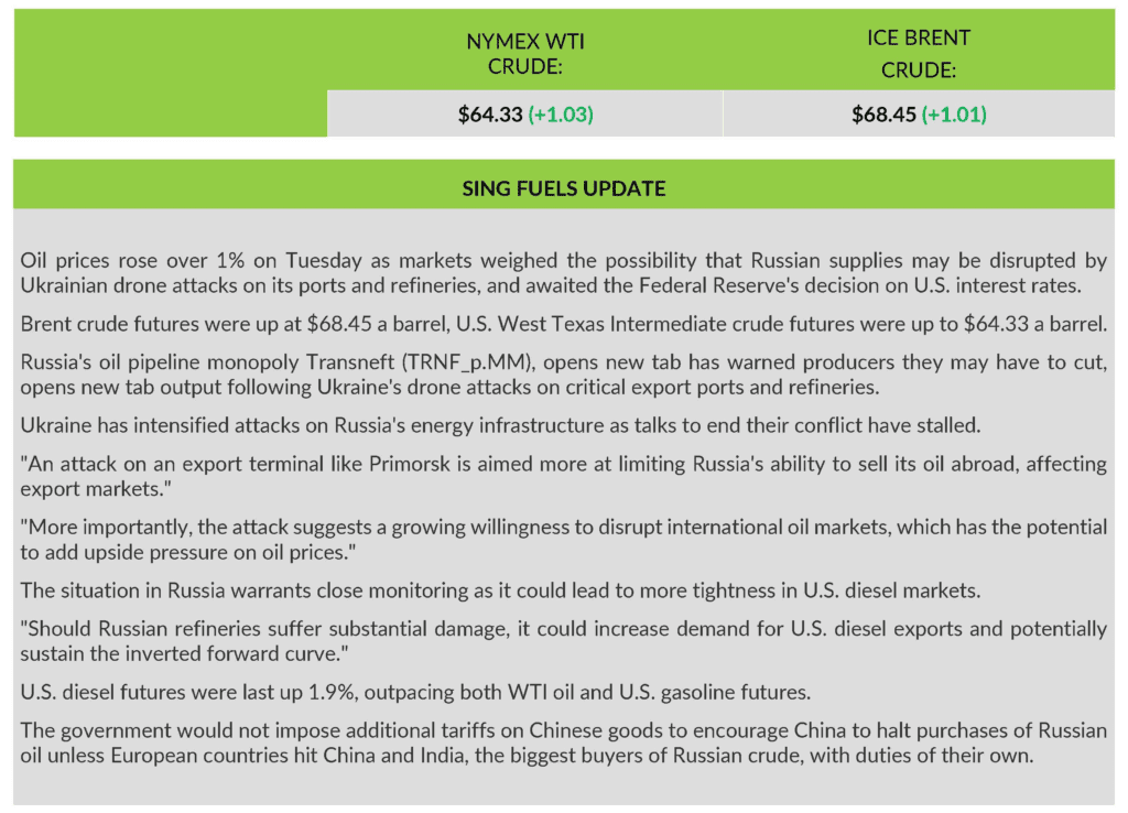 Sing Fuels Daily Report – 16 September 2025 by admin September 16, 2025 September 16, 2025 9 views 144 Brent CrudeChinaIndiaRussiaSingaporeSingFuelsTariffsTransneftUkraineWTI (West Texas Intermediate) 0 comments 0 FacebookTwitterLinkedinEmail admin previous post Greek shipping, a leading force worldwide, co-shapes developments and contributes to the prosperity of our homeland next post HOT PORT NEWS from GAC You may also like BAAFEx returning in 2027 as Asia Strengthens Position... April 22, 2026 DNV and SIT sign new agreement to advance... April 22, 2026 HOT PORT NEWS from GAC April 21, 2026 Maritime Coalition Representing Half the World’s Fleet Calls... April 21, 2026 Stubbs: Portrait of a Horse. National Gallery on... April 21, 2026 Christina Tsorba of Vergina TV questions All About... April 21, 2026 EcoNavis to lead US integrated propulsion study April 21, 2026 Vessev Unlocks Waterways as the Next Layer of... April 21, 2026 Immersion suit rises to challenge for faster protection April 21, 2026 Bubble Robotics raises $5M to build the ocean’s... April 21, 2026 Leave a Comment Cancel Reply Save my name, email, and website in this browser for the next time I comment. Δ