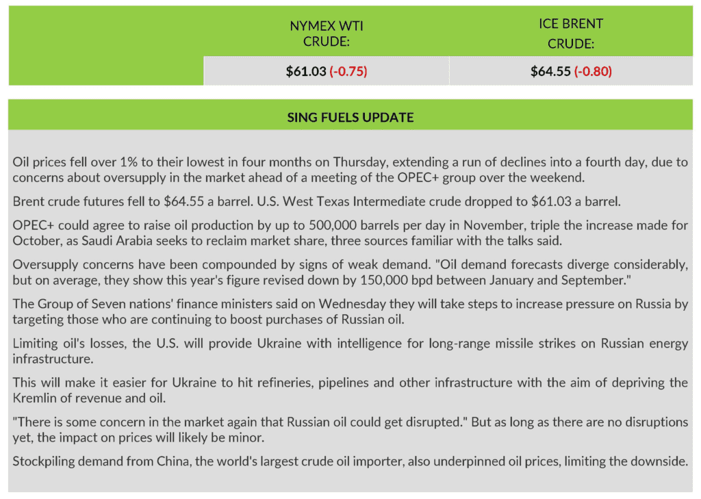 Sing Fuels Daily Report – 2 October 2025 by admin October 2, 2025 October 2, 2025 16 views 151 Brent CrudeOPEC+RussiaRussian OilSaoudi ArabiaSingaporeSingFuelsUkraineUkraine - Russia conflictUSAWTI (West Texas Intermediate) 0 comments 0 FacebookTwitterLinkedinEmail admin previous post Investors pull £1.8bn from funds in August as caution widens next post HOT PORT NEWS from GAC You may also like D-2 to the French Olympic Week of Hyères... April 18, 2026 From LNG to low‑GHG methane: The next step... April 18, 2026 London based fund with Greek interests, secures the... April 17, 2026 Statement from the International Chamber of Shipping related... April 17, 2026 HOT PORT NEWS from GAC April 17, 2026 IMO approves new guidelines on ship registratio April 17, 2026 S&P 500 heads for new heights as Iran... April 17, 2026 IMO Secretary-General statement to the France-UK Summit on... April 17, 2026 LR – Engine Retrofit Report: Applying alternative fuels... April 17, 2026 Strategic expansion in the Greek market: MASO Strategic... April 17, 2026 Leave a Comment Cancel Reply Save my name, email, and website in this browser for the next time I comment. Δ