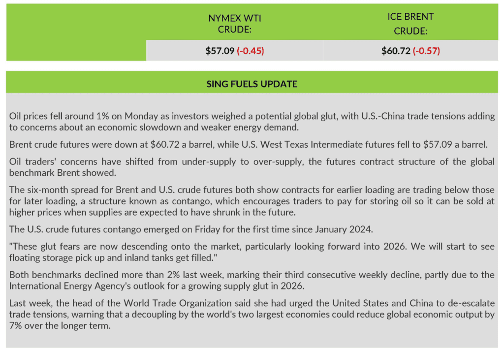 Sing Fuels Daily Report – 20 October 2025 by admin October 20, 2025 October 20, 2025 15 views 275 Brent CrudeChinaSingaporeSingFuelsThe International Energy Agency (IEA)USAWTI (West Texas Intermediate)WTO (World Trade Organisation) 0 comments 0 FacebookTwitterLinkedinEmail admin previous post HOT PORT NEWS from GAC next post Budget threats for HENRYs – despite ‘not being rich yet’ You may also like D-2 to the French Olympic Week of Hyères... April 18, 2026 From LNG to low‑GHG methane: The next step... April 18, 2026 London based fund with Greek interests, secures the... April 17, 2026 Statement from the International Chamber of Shipping related... April 17, 2026 HOT PORT NEWS from GAC April 17, 2026 IMO approves new guidelines on ship registratio April 17, 2026 S&P 500 heads for new heights as Iran... April 17, 2026 IMO Secretary-General statement to the France-UK Summit on... April 17, 2026 LR – Engine Retrofit Report: Applying alternative fuels... April 17, 2026 Strategic expansion in the Greek market: MASO Strategic... April 17, 2026 Leave a Comment Cancel Reply Save my name, email, and website in this browser for the next time I comment. Δ