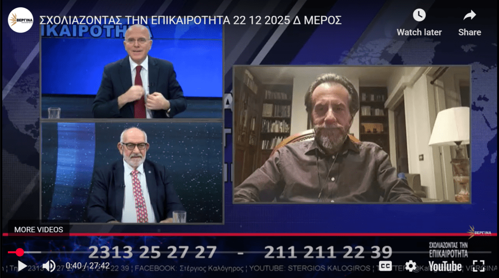 Following part C (which please view here), we were honoured once again to participate in an important current affairs issue, that of statistics vis-a-vis the political spectrum of Greece with Vergia TV’s STERGIOS Kalogiros questioning political analyst Dimitrios Vassiliadis of “Interview” with John Faraclas commenting.