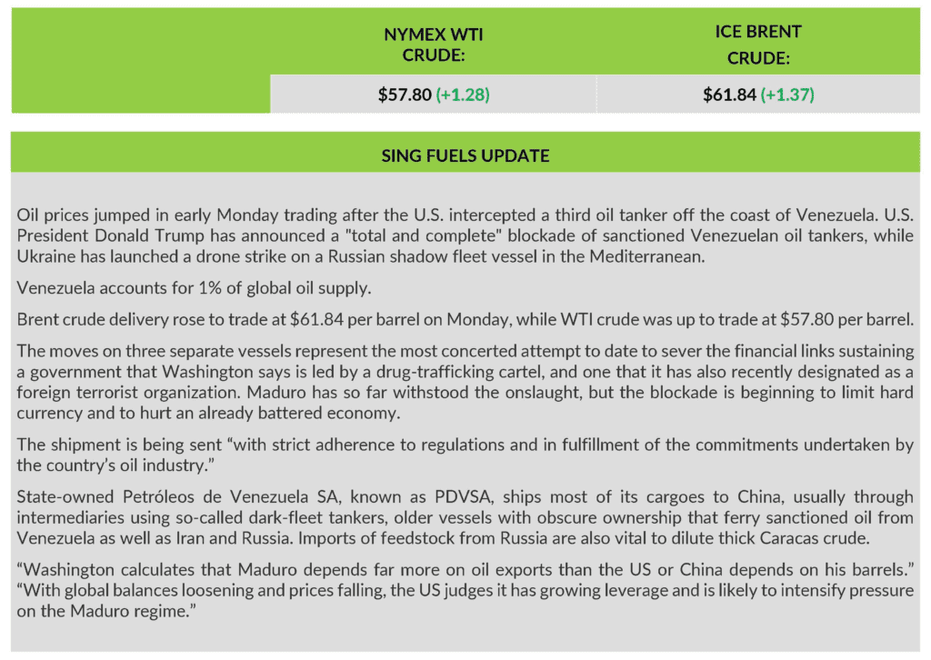 Sing Fuels Daily Report – 22 December 2025 by admin December 22, 2025 December 22, 2025 24 views 232 Brent CrudeChinaG A CPetroleos de Venezuela SA (PDVSA)RussiaRussian shadow fleetUkraineUS President Donald TrumpUSAVenezuelaWTI (West Texas Intermediate) 0 comments 0 FacebookTwitterLinkedinEmail admin previous post Aegean Protective Coatings S.A. and PPG Successfully Apply Cutting-Edge Electrostatic Technology on Greek Shipyards next post Live geopolitical issues at VERGINA TV with Stergios Kalogiros interviewing Lt.Gen(Rt) Lazaros Kambouridis and John Faraclas commenting You may also like Annual marine autonomy study reports new USV ‘arms... April 20, 2026 Market report: Stock markets mixed as Strait re-opening... April 20, 2026 StormGeo strengthens Bunker Management platform with real-time pricing... April 20, 2026 Multimodal Corridors Gain Ground as Supply Chains Reconfigure,... April 20, 2026 Sing Fuels Morning Report – 20 April 2026 April 20, 2026 NYK Line, Golden Island, and Yara Clean Ammonia... April 20, 2026 Procureship strengthens Asia-Pacific presence as key shipowners in... April 20, 2026 D-2 to the French Olympic Week of Hyères... April 18, 2026 From LNG to low‑GHG methane: The next step... April 18, 2026 London based fund with Greek interests, secures the... April 17, 2026 Leave a Comment Cancel Reply Save my name, email, and website in this browser for the next time I comment. Δ