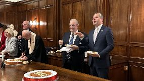 On January 22, London-based Greek Shipping Co-operation Committee (GSCC) held a traditional Vasilopita cake-cutting ceremony to mark the New Year 2026 in the beautiful setting of the Staple Inn Hall, with GSCC Chairman Haralambos J. Fafalios (pictured, centre) and IMO Secretary-General Arsenio Dominguez (right) addressing the audience.