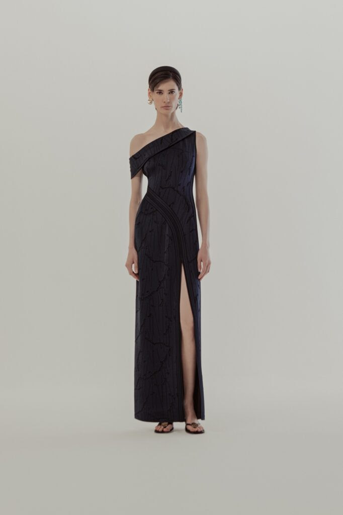 Dresses sweep and spiral with both restraint and boldness, featuring asymmetrical cuts, bare shoulders, and artful slits that engage with the light. A blue‑black one‑shoulder gown evokes moonlit branches against night sky, while a halter‑neck maxi in green and blue channels breezy elegance. There are moments where athletic minimalism intersects with haute allure, visible in sleek tailoring styled with stockings or layered under exquisitely cut chemisiers.