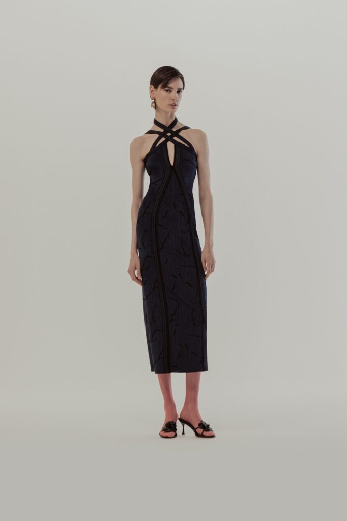 The cracklè motif, an abstract tribute to fissured stone and sunbaked soil, whispers through the collection like a visual refrain. Silhouettes celebrate the natural grace of the body, sculpted with architectural precision and draped in stretch‑infused fabrics that contour with fluid confidence.