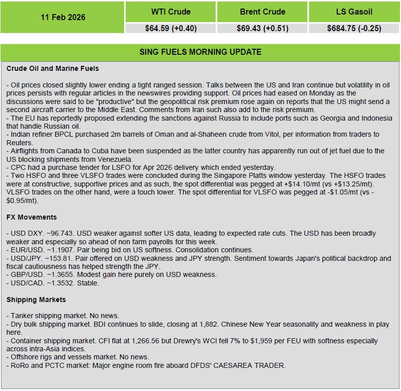 Sing Fuels Morning Report – 11 February 2026 by admin February 11, 2026 February 11, 2026 16 views 159 Brent CrudeSingaporeSingFuelsWTI (West Texas Intermediate) 0 comments 0 FacebookTwitterLinkedinEmail admin previous post SEA.AI Receives Jury’s Special Mention at Euromaritime Awards next post MAIB Report: collision between the bulk carrier Polesie and the general cargo ship Verity resulting in the sinking of the Verity with five fatalities, German Bight traffic separation scheme You may also like Day 6 – Italy and China strike gold... April 25, 2026 Poetic Living: Luisa Beccaria’s Interior Design Debut Brings... April 25, 2026 Navigating the Great Transitions: Strategic Insights from Delphi... April 25, 2026 RINA grants Type Approval to SRC Group’s Methanol... April 25, 2026 Monaco goes full throttle with triple Grand Prix... April 25, 2026 The Maritime Advocate–Issue 906 April 24, 2026 HOT PORT NEWS from GAC April 24, 2026 Diana Shipping Inc. Calls on Genco Shipping &... April 24, 2026 No safe transit through Strait of Hormuz: IMO... April 24, 2026 Patrik Gustafsson on How IKEA’s “Food For Thought”... April 24, 2026 Leave a Comment Cancel Reply Save my name, email, and website in this browser for the next time I comment. Δ