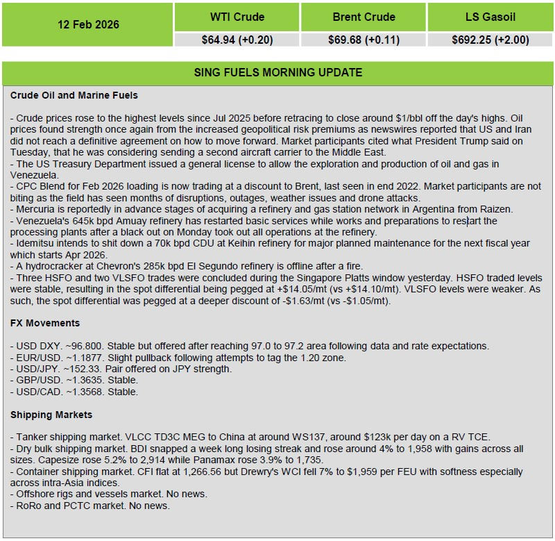 Sing Fuels Morning Report – 12 February 2026 by admin February 12, 2026 February 12, 2026 21 views 145 Brent CrudeMiddle EastSingaporeSingFuelsUS Treasury DepartmentVenezuelaWTI (West Texas Intermediate) 0 comments 0 FacebookTwitterLinkedinEmail admin previous post The Panama Canal and The U.S. Grains & BioProducts Council Sign Memorandum of Understanding next post Uncertainty ahead as MEB hosts 2026 global outlook talk You may also like London based fund with Greek interests, secures the... April 17, 2026 IMO approves new guidelines on ship registratio April 17, 2026 S&P 500 heads for new heights as Iran... April 17, 2026 IMO Secretary-General statement to the France-UK Summit on... April 17, 2026 LR – Engine Retrofit Report: Applying alternative fuels... April 17, 2026 Strategic expansion in the Greek market: MASO Strategic... April 17, 2026 DNV- Upcoming training courses April 17, 2026 Owners need to consider the scope of their... April 17, 2026 Market report: Middle East de-escalation gathers pace April 17, 2026 Monaco joins French Riviera set for The White... April 17, 2026 Leave a Comment Cancel Reply Save my name, email, and website in this browser for the next time I comment. Δ