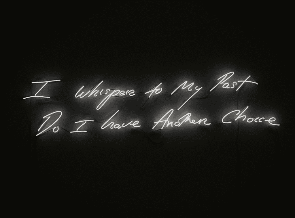 The neon texts are stark, such as I whisper to my past, do I have another choice (2010). In 2011 she made a gift to the UK government of her neon work More Passion but asked for it to be taken down after the “shameful” partying at Downing Street during Covid lockdown came to light.