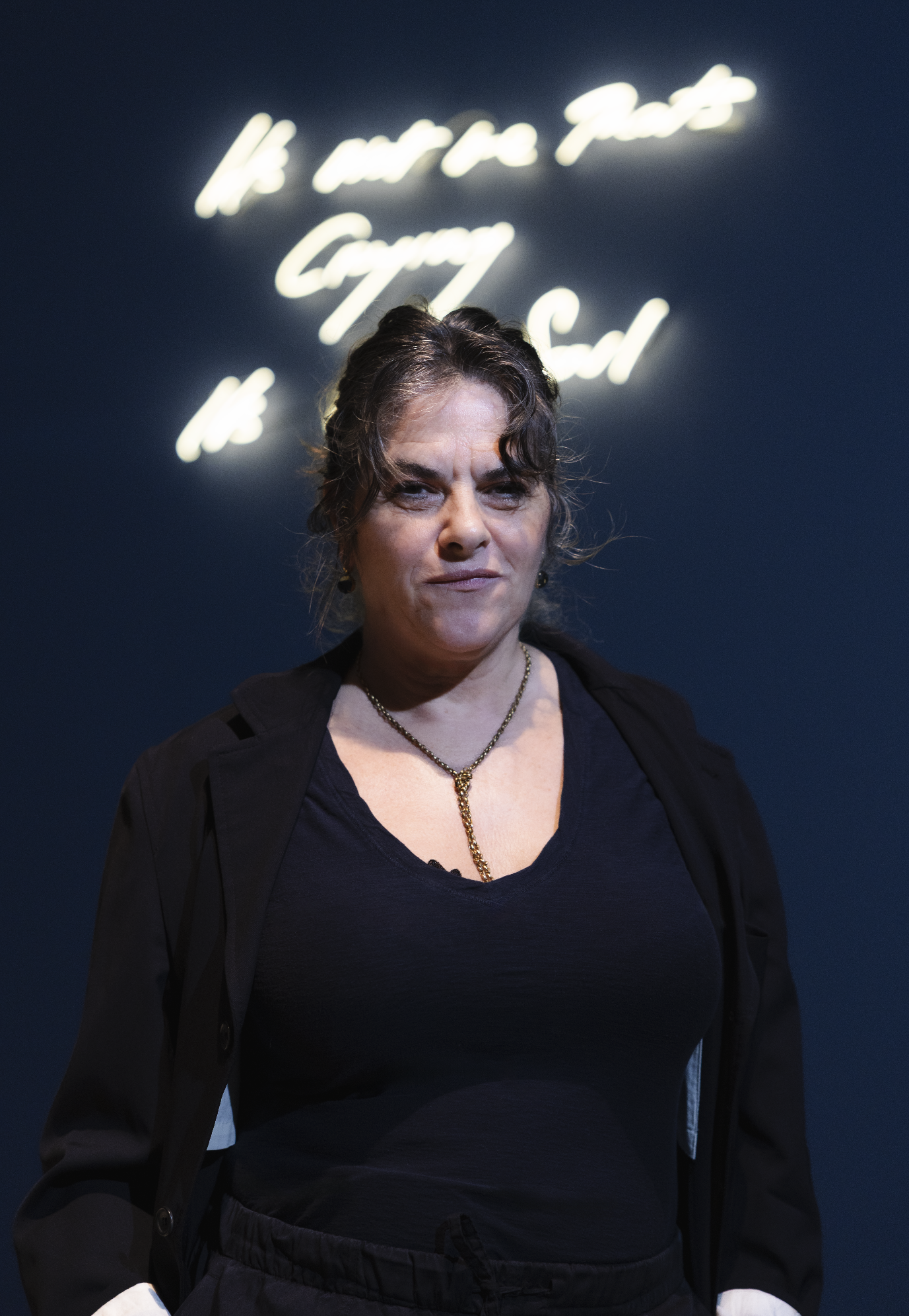 Her resilience and unabashed self-expression are spelled out across paintings, videos, monoprints, drawings, sculpture and embroidery… and in her unapologetic cries from the heart in her distinctive handwriting in neon signage.