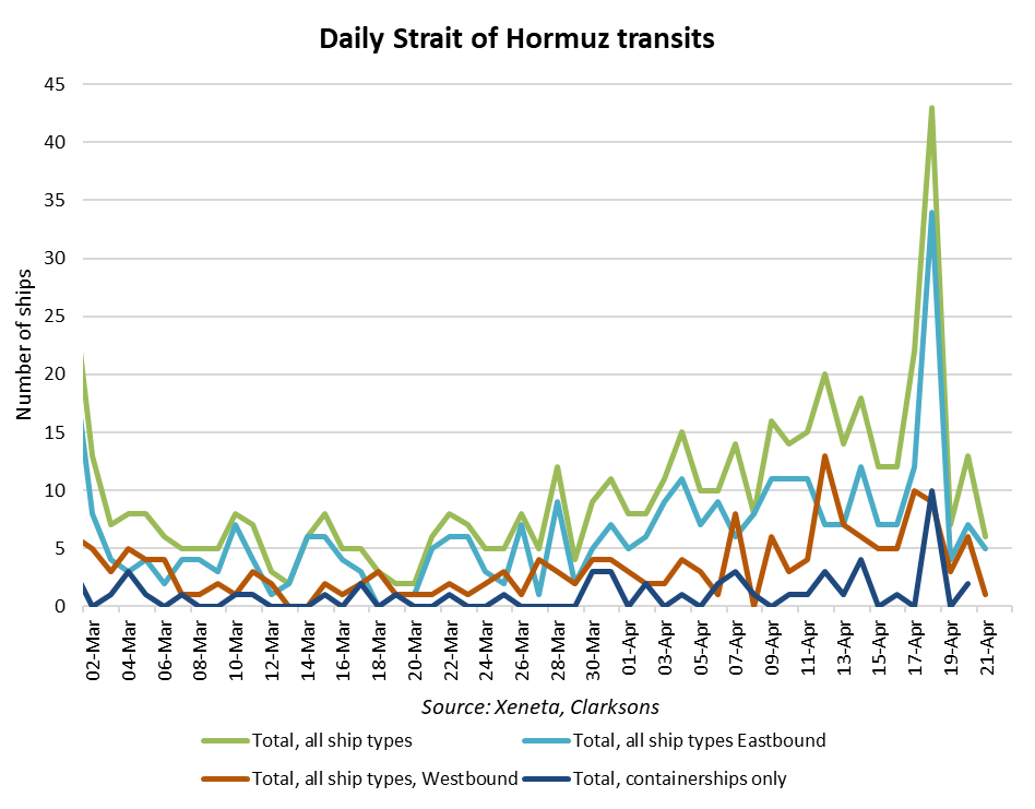 Sand said: “The lowest number of transits was mid-March, but since then it has been gradually increasing despite the blockades, which have been leaky from the start. Saturday saw a post-conflict high of 43 transits, including 10 container ships, possibly in response to increased hopes the Strait was re-opening.