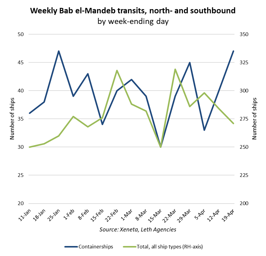 Average ocean container shipping spot rates from China to Jeddah – a key land bridge set up to connect Middle East destinations cut off by the de facto closure of the Strait of Hormuz – are up 63% since the escalation of conflict on 28 February. However, they have fallen 11% during April to stand at USD 4 969 per FEU (40ft container).
